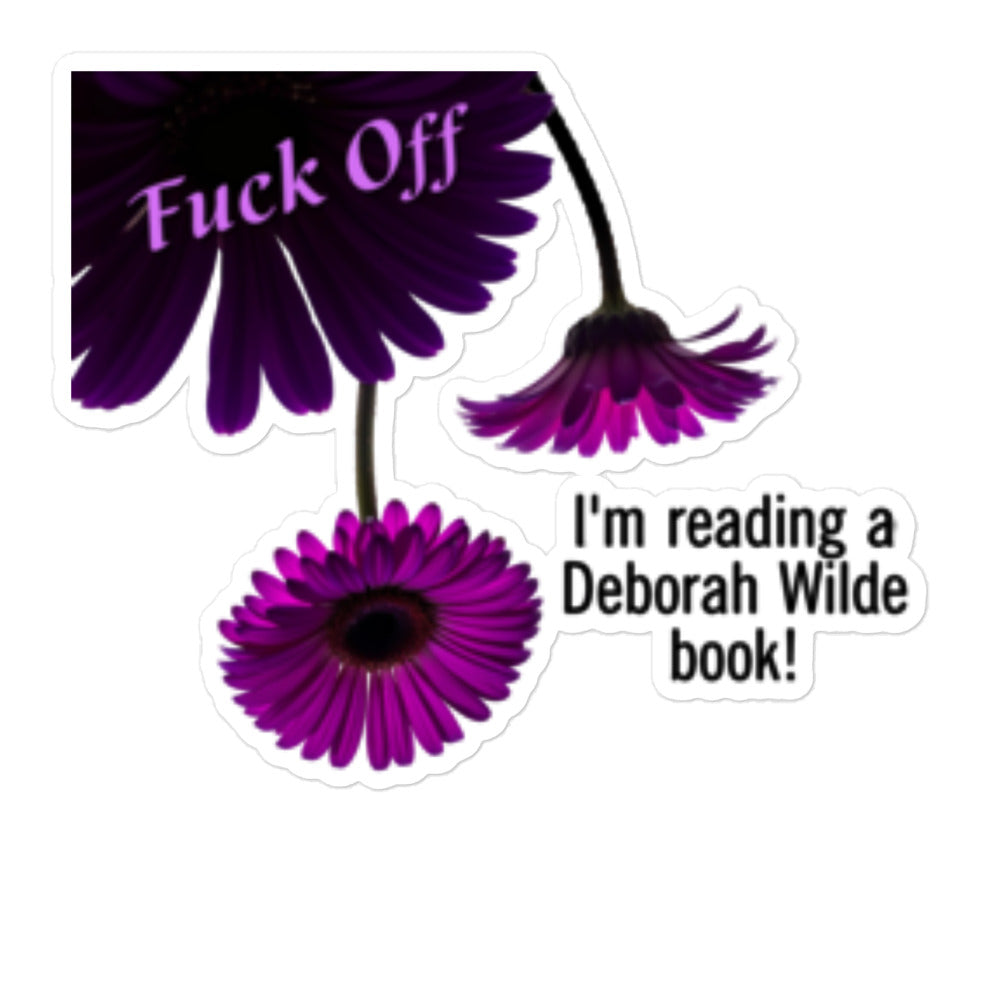 Kiss cut sticker with purple daisies and the text "Fuck off. I'm reading a Deborah Wilde book!