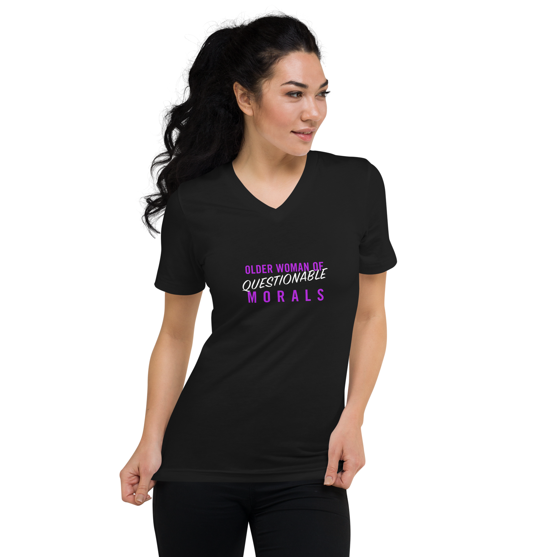 Product mockup black v-neck tshirt with works "Older woman of questionable morals"