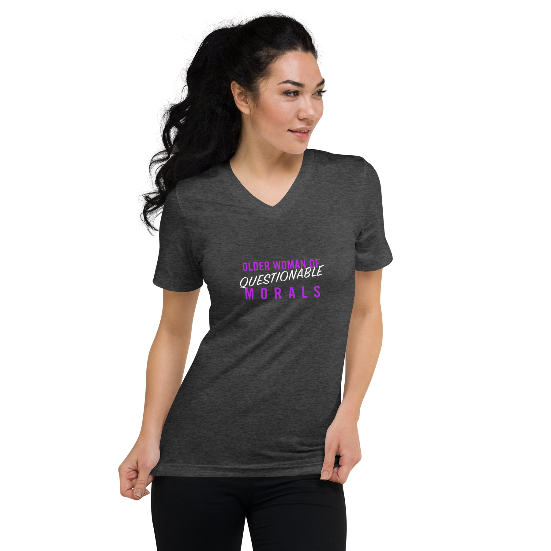 Product mockup dark grey v-neck tshirt with text "older woman of qeustionable morals"